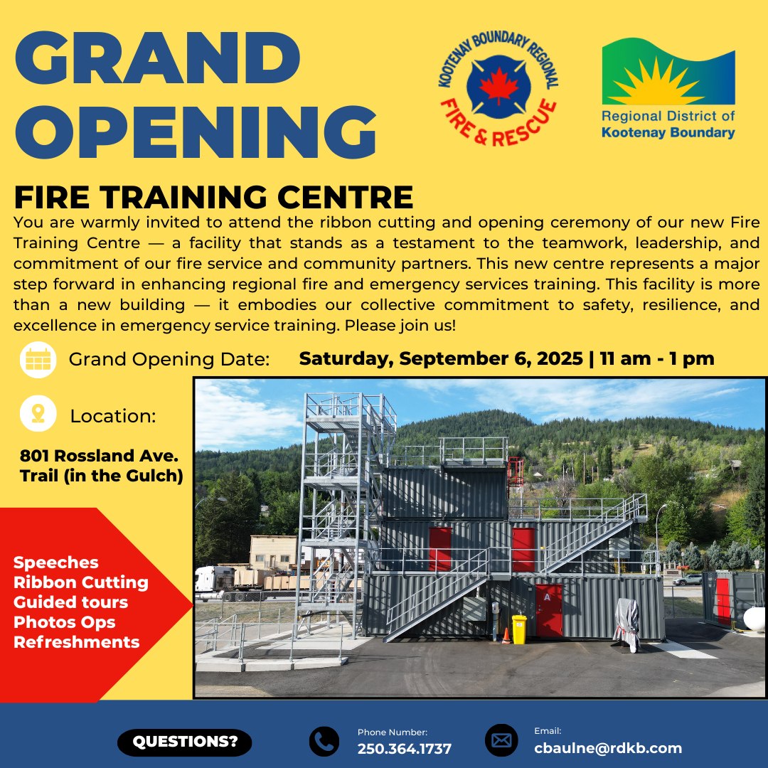 This weekend I look forward to attending some events including the Grand Opening of the Fire Training Centre in Trail and the Opening Exhibit gathering at Elk Root Conservation in Vallican. (posters attached)